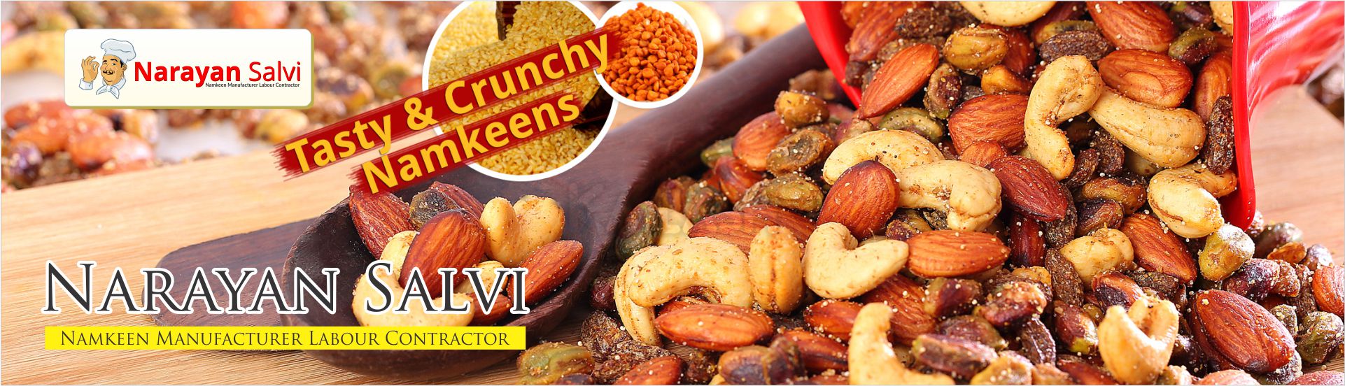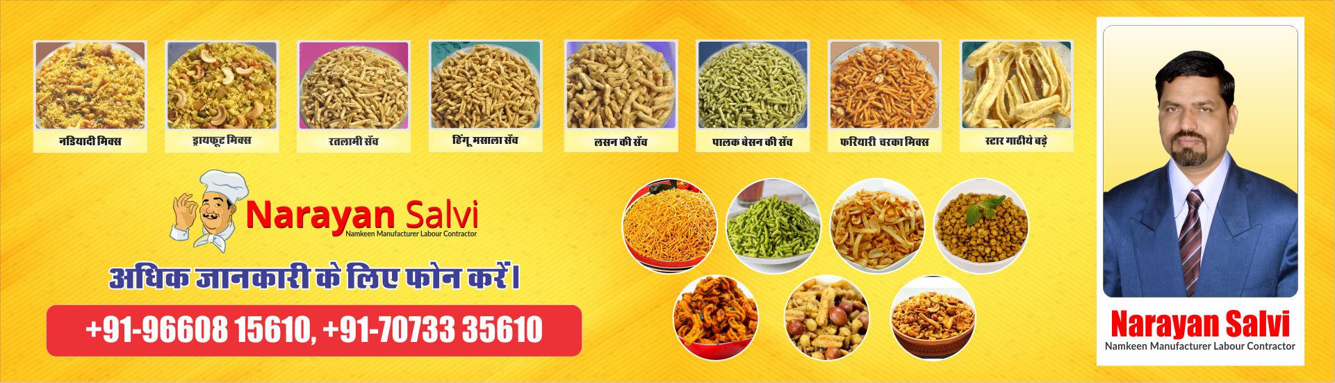 I ( Narayan Salvi have 27 years experience of manufacturing various namkeen products. My speciality in Bikaneri Moth Bhujiya, Indore Khatta Meetha Mixture, Special Ratlami Sev, Mast Kirn, Delhi Mix, Navratan Mix, Singh Bhujiya, Peenut, Special Long Sev, Bombay Mix, Mungdaal. I have expertise in making 300+ Namkeen products.